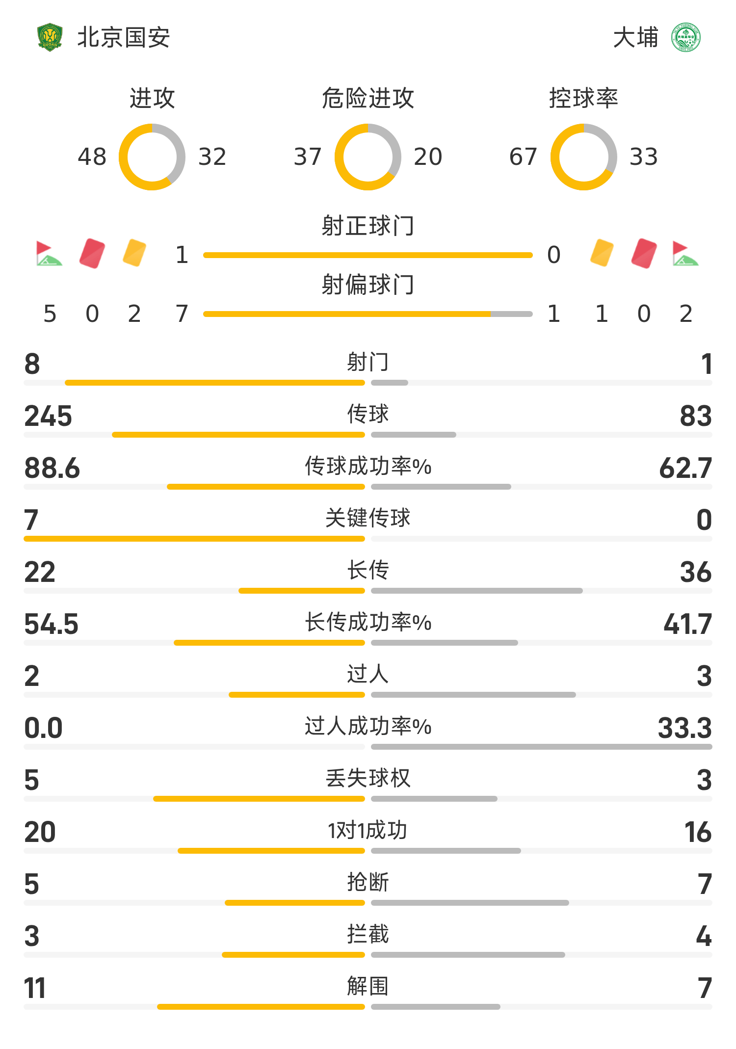 北京国安首发阵容:39-张健智、27-王刚、5-恩加德乌、3-何宇鹏、26-柏杨、21-张源、23-达万、8-古加、29-法比奥、37-曹永竞、9-张玉宁