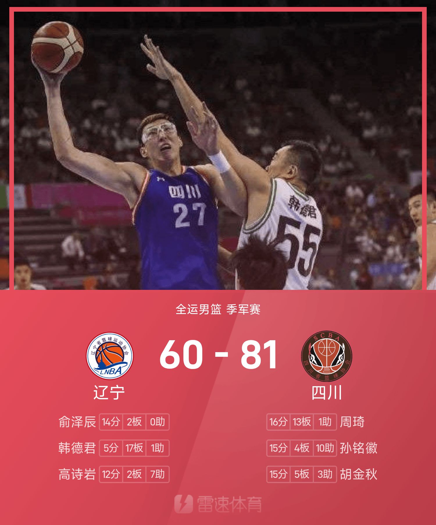 双方全场战罢,四川81-60战胜辽宁,夺得全运男篮铜牌。